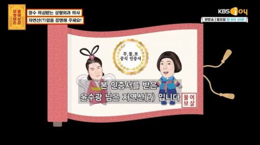 이수근은 쌍꺼풀 수술한 사람은 실밥이 만져진다는 말을 듣고 라인을 만져봤다 그는 "얘 (실밥) 없네"라고 했다. 서장훈은 "어릴 적 사진이 성형안했음을 알려주지 않나"라고 했다.