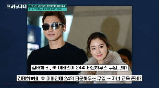 비와 김태희는 미국 캘리포니아주 어바인에 한화 24억원에 달하는 타운하우스를 구입한 것으로 알려졌다. 어바인이 미국에서도 대입 시험 성적이 1, 2위를 다툴 정도로 학구열이 높은 도시이기 때문이라고. 그만큼 높은 학비로도 유명했다. 유치원만 해도 3천만원, 초등학교는 4천만원, 중학교는 7천만원, 고등학교는 8천만원에 달해 생활비까지 더하면 교육기간 동안만 족히 10억원 이상의 비용이 들어갈 것으로 전해졌다.