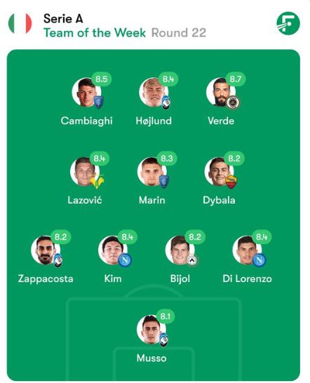 축구통계매체 '폿몹(FotMob)'은 14일(한국시간) SNS을 통해 "세리에A TOTW(Team of the Week, 이주의 팀)"을 발표했다.