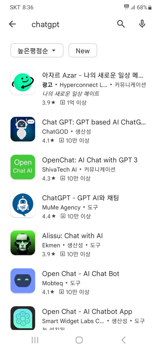 구글 플레이스토어에 '챗GPT'를 검색하면 나오는 모바일 앱./구글 플레이스토어 캡처 |