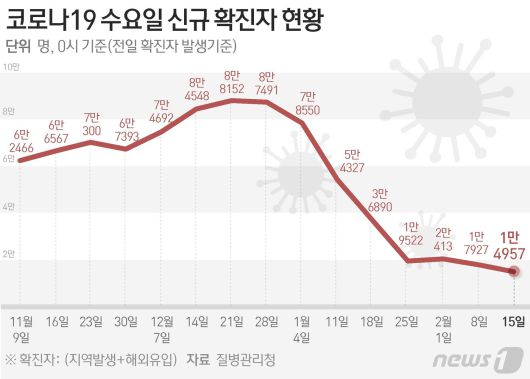 (서울=뉴스1) 윤주희 디자이너 = 질병관리청 중앙방역대책본부(방대본)는 15일 0시 기준 신종 코로나바이러스 감염증(코로나19) 신규 확진자가 1만4957명 발생했다고 밝혔다.ajsj999@news1.krCopyright ⓒ 뉴스1. All rights reserved. 무단 전재 및 재배포 금지.