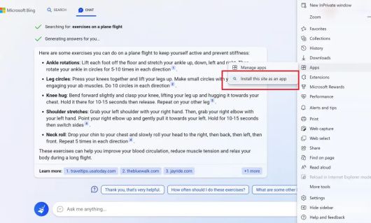 - 마이크로소프트 엣지를 사용해 빙, 챗GPT 혹은 바드를 윈도우 앱으로 저장한다 : 이 방법은 마이크로소프트 엣지에만 적용된다. 추가 옵션을 표시하려면 오른쪽 상단 코너의 줄임표 메뉴(…)를 클릭한 후 앱 항목이 나타날 때까지 메인 메뉴에서 아래로 스크롤한 다음 ‘이 사이트를 앱으로 설치’로 이동한다. 이제 ‘앱’의 이름을 쓰고 작업 표시줄, 시작 메뉴 혹은 모두 중 어디에 저장할지 선택하면 된다.