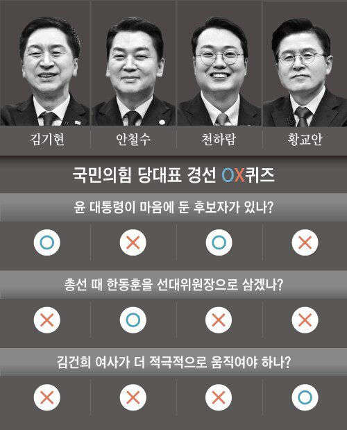 OX 문답에서 ‘윤석열 대통령이 이번 전당대회에 마음에 둔 후보가 있다’는 질문에 김기현, 천하람 후보는 ‘O’를, 안철수, 황교안 후보는 ‘X’를 택했다.