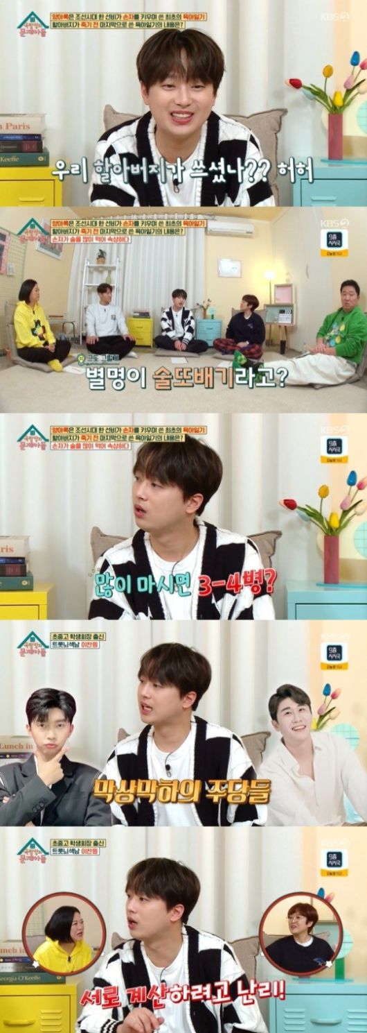 한편 “조선시대의 한 선비가 손자를 키우며 쓴 최초의 육아일기 ‘양아록’에서 할아버지가 죽기 전 마지막으로 남긴 말은?”이라는 문제를 받고 답을 궁리해보던 이찬원은 ‘술’이라는 힌트를 듣고 “우리 할아버지가 쓰셨나?”라고 갸우뚱하며 “’술을 멀리 하거라’”라고 답을 댔다. 정답은 이와 비슷한 ‘손자가 술을 많이 먹어 속상하다’였다.