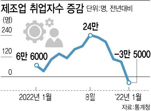 15일 통계청이 발표한 ‘2023년 1월 고용동향’에 따르면 지난달 제조업 분야 취업자수는 443만 2000명으로 전년동월대비 3만5000명 줄어든 것으로 집계됐다. 제조업 취업자 수는 2021년 10월(-1만3000명) 이후 15개월 만에 감소로 전환했다.