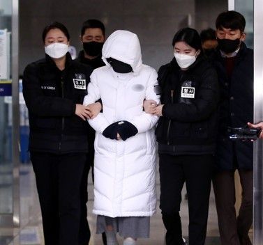 12살 초등학생 아들을 학대해 숨지게 한 혐의를 받는 엄마가 16일 인천 논현경찰서에서 나와 검찰로 송치되고 있다.|연합뉴스 제공 |
