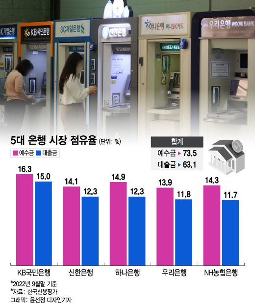 16일 한국신용평가에 따르면 지난해 9월말 기준 5대 은행의 예수금 시장 점유율은 73.5%로 집계된다. 국민 10명 중 7명은 5대 은행의 예금상품을 이용한다는 의미다. 5대은행의 대출금 시장 점유율은 63.1%다. 가계대출로 범위를 좁히면 점유율은 더 상승한다.