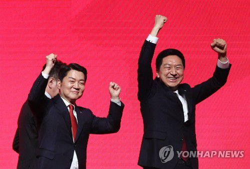 지지자들 향해 인사하는 안철수와 김기현 |