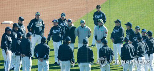 (투손[미국 애리조나주]=연합뉴스) 홍해인 기자 = 16일(현지시간) 미국 애리조나주 투손 키노스포츠 콤플렉스에서 열린 월드베이스볼클래식(WBC) 2023 대한민국 대표팀과 프로야구 KBO리그 NC 다이노스와의 연습경기에 앞서 대표팀 야수조 선수들이 팀 미팅을 갖고 있다. 2023.2.17