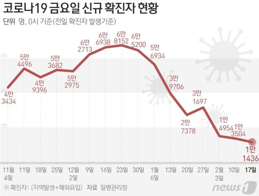 (서울=뉴스1) 김초희 디자이너 = 질병관리청 중앙방역대책본부(방대본)는 17일 0시 기준 신종 코로나바이러스 감염증(코로나19) 신규 확진자가 1만436명 발생했다고 밝혔다a_a@news1.krCopyright ⓒ 뉴스1. All rights reserved. 무단 전재 및 재배포 금지.