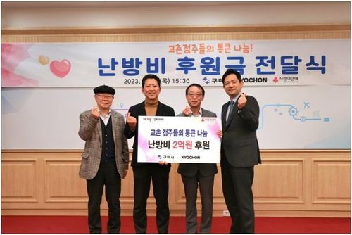 ▲ 교촌치킨을 운영하는 교촌에프앤비[339770]는 가맹점주들과 함께 교촌치킨의 출발지인 경북 구미시에 후원금 2억원을 전달했다고 17일 밝혔다. 후원금은 구미시 저소득 다자녀 가구 500세대의 난방비 지원에 쓰인다. (서울=연합뉴스)