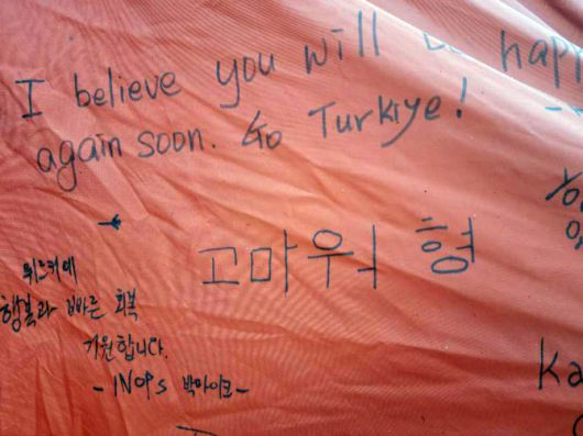 15일(현지시간) 튀르키예 하타이 주 안타키아에 설치된 한국긴급구호대 숙영지 텐트에 한 튀르키예 시민이 한국어로 “고마워 형”이라고 쓴 문구가 남아있다.  [사진=대한민국 긴급구호대 제공]