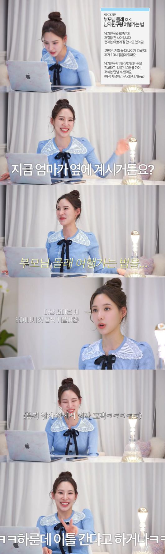 이어 그는 "저는 단 둘이는 못 갔다. 엄마가 매일 영상통화를 했다. 그래서 친구 커플과 가던가 친구들과 갔다"며 "아니면 MT가 하루인데 이틀이라고 했다. 그런데 결국 걸리더라. 아는데 모르는 척 해주시는 것"이라고 자신의 경험을 이야기했다.