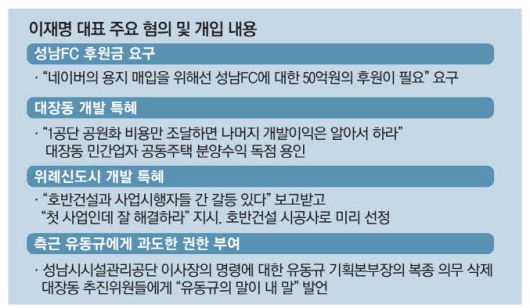 이 대표는 네이버 등 지역 현안이 있는 기업들에 편의를 봐주는 대신 성남FC에 후원금을 내줄 것을 요구하고, 법에 저촉될 것을 우려하는 기업 관계자들에게 기부단체를 경유하는 방법 등을 구체적으로 제안한 것으로 파악된다. 그 외에도 위례신도시·대장동 민간 개발업자들에게 직접 지시를 통해 대폭 혜택을 몰아준 정황이 나왔다.