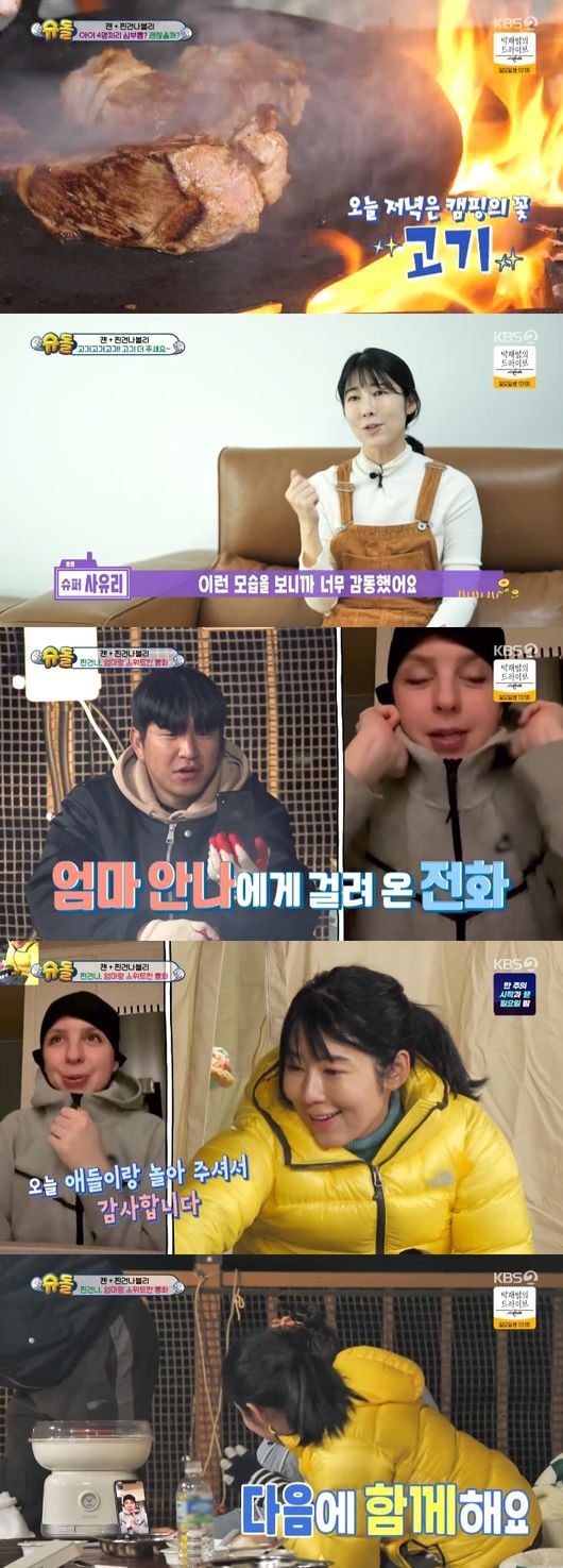 다음 장소는 캠핑이었다. 박주호는 "누님이 사물놀이 초대해 주셨으니까 저도 요즘 캠핑에 입문해서 시간이 될때마다 시도해보고 있다. 누님도 오늘 캠핑 가서 힐링 하시면 어떨까 싶었다"며 "오늘은 젠의 엄마가 아닌 자연에 놀러왔다..놀러 왔는데 저기 가족들이 놀러왔네? 네명이나 있네? 그런거다"라고 설명했다.