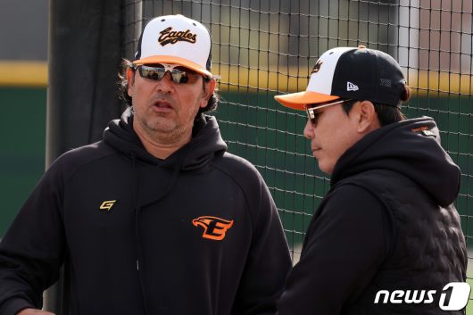 (애리조나(미국)=뉴스1) 황기선 기자 = 한화 이글스 수베로 감독과 이대진 수석코치가 18일(현지시간) 미국 애리조나주 메사 벨뱅크파크에서 열린 '2023 한화 스프링캠프'에서 대화를 나누고 있다. 2023.2.19/뉴스1juanito@news1.krCopyright ⓒ 뉴스1. All rights reserved. 무단 전재 및 재배포 금지.