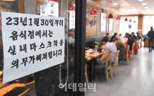마스크 해제와 관련한 안내문이 실내 마스크 착용 의무 해제를 하루 앞둔 지난달 29일 오전 서울 영등포구 한 식당에 붙여져 있다. 실내 마스크 착용 의무는 시행된 지 약 27개월 만인 지난달 30일부터 권고 사항으로 전환됐다. 다만 의료기관과 약국, 요양병원·장기요양기관, 정신건강증진시설, 장애인복지시설 등 감염 취약시설, 대중교통에서는 마스크 착용 의무가 그대로 적용된다. (사진=이영훈 기자) |