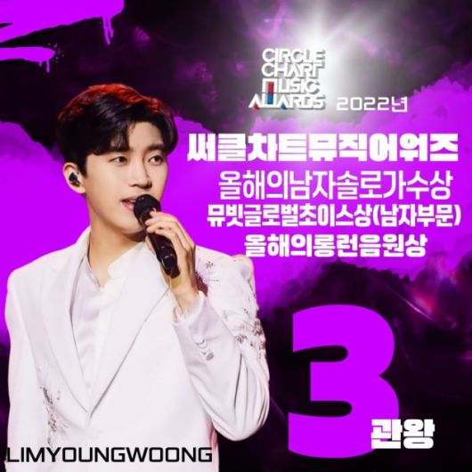 가수 임영웅 '써클차트 뮤직어워즈 2022'에서 올해의 남자솔로가수상•뮤빗글로벌 초이스상• 올해의롱런음원상을 수상하며 3관왕에 올랐다.