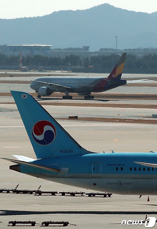 (인천공항=뉴스1) 박정호 기자 = 19일 오후 인천국제공항 전망대에서 바라본 계류장에서 착륙한 아시아나항공 항공기가 대기 중인 대한항공 항공기 앞을 지나고 있다. 유럽연합(EU) 반독점 규제당국은 대한항공의 아시아나항공 기업결합 관련해 2단계 심사에 착수했으며, 2단계 심사 결과는 오는 7월5일 발표될 예정이다. 2023.2.19/뉴스1