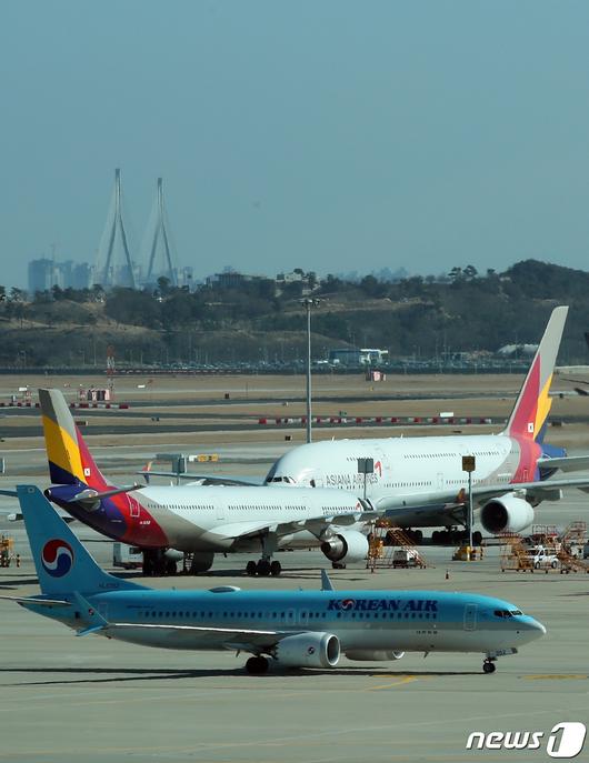 (인천공항=뉴스1) 박정호 기자 = 19일 오후 인천국제공항 전망대에서 바라본 계류장에서 대한항공 항공기가 아시아나항공 항공기 앞을 지나고 있다. 유럽연합(EU) 반독점 규제당국은 대한항공의 아시아나항공 기업결합 관련해 2단계 심사에 착수했으며, 2단계 심사 결과는 오는 7월5일 발표될 예정이다. 2023.2.19/뉴스1