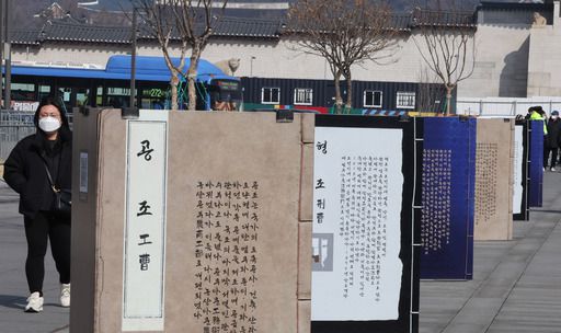 19일 서울 종로구 광화문광장에 마련된 광화문·육조거리 매장 문화재 발굴이야기 전시회에 설치된 대형 책 형태의 전시물을 시민들이 살펴보고 있다. 이제원 선임기자 ⓒ 세상을 보는 눈, 세계일보