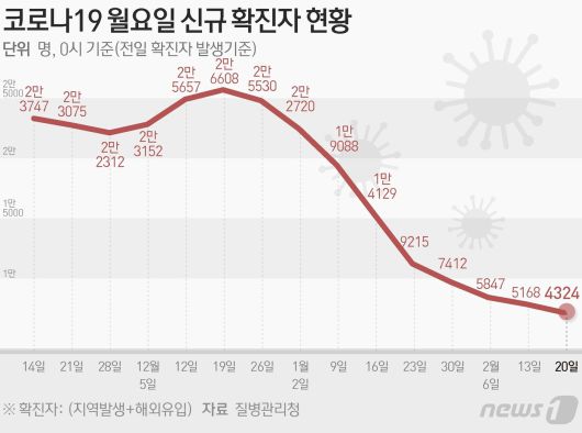 (서울=뉴스1) 양혜림 디자이너 = 질병관리청 중앙방역대책본부(방대본)는 20일 0시 기준 신종 코로나바이러스 감염증(코로나19) 신규 확진자가 4324명 발생했다고 밝혔다.hrhohs@news1.krCopyright ⓒ 뉴스1. All rights reserved. 무단 전재 및 재배포 금지.