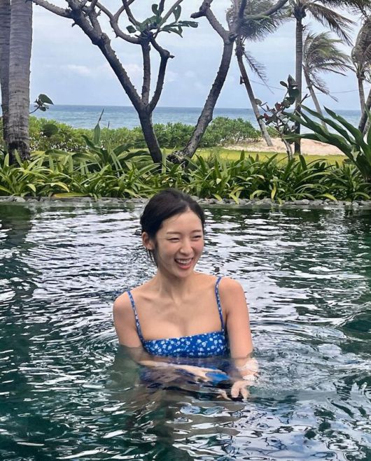 그룹 오마이걸 멤버 아린이 수영장에서 여유를 즐기는 모습을 공개했다.