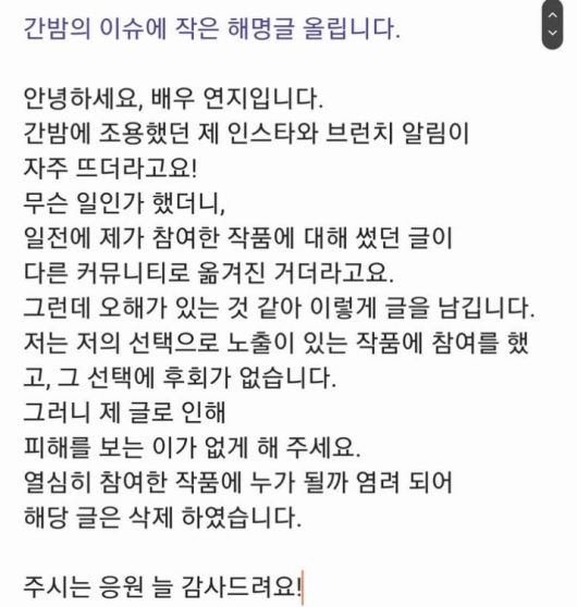 20일 연지는 자신의 SNS를 통해 "간밤에 조용했던 제 인스타그램과 브런치 알림이 자주 뜨더라. 무슨 일인가 했더니, 일전에 제가 참여했던 작품에 대해 썼던 글이 다른 커뮤니티로 옮겨진 것 같다"고 말문을 열었다.