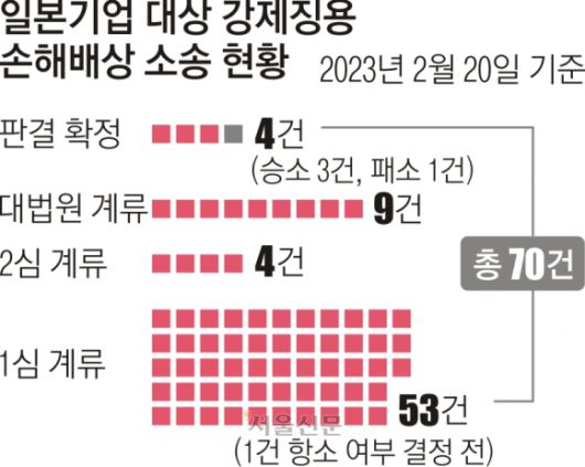 20일 현재 국내에서 강제동원 관련 일본 기업을 상대로 한 손해배상 소송은 총 70건이다. 이 중 3건은 대법원에서 피해자 측 승소로 확정판결이 났다. 그러나 50여건은 1심 단계에서 ‘소멸시효 기산점(계산을 시작하는 시점)’ 등을 두고 다투는 상황이다.