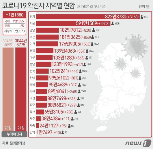 (서울=뉴스1) 양혜림 디자이너 = 21일 질병관리청 중앙방역대책본부에 따르면 이날 0시 기준 국내 코로나19 누적 확진자는 1만1880명 증가한 3044만5775명으로 나타났다. 신규 확진자 1만1880명(해외 유입 25명 포함)의 신고 지역은 서울 2503명(해외 3명), 부산 868명, 대구 565명(해외 4명), 인천 562명(해외 4명), 광주 279명, 대전 316명, 울산 238명, 세종 95명, 경기 3160명, 강원 248명, 충북 317명(해외 2명), 충남 417명, 전북 444명, 전남 383명, 경북 534명(해외 2명), 경남 820명, 제주 121명, 검역 과정 10명이다.