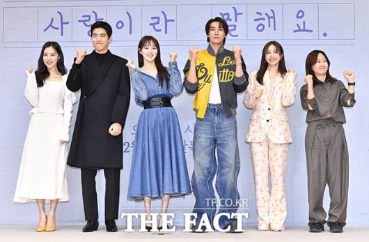 [더팩트ㅣ박헌우 기자] 배우 김예원과, 성준, 이성경, 김영광, 안희연, 감독 이광영(왼쪽부터)이 21일 오전 서울 종로구 JW 메리어트 동대문 스퀘어 서울에서 열린 디즈니 플러스 드라마 '사랑이라 말해요' 제작발표회에 참석해 포즈를 취하고 있다.