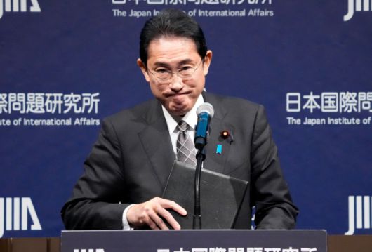 20일 일본 도쿄에서 열린 한 국제 심포지엄에 참석한 기시다 후미오 총리가 마이크 앞에서 굳은 표정을 짓고 있다. 도쿄=AP 뉴시스 |