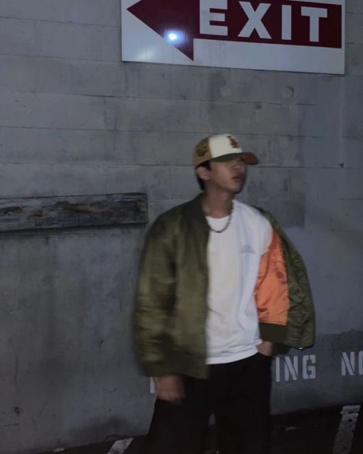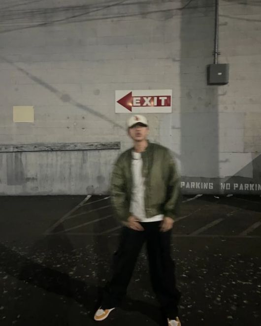임영웅은 흰 티셔츠, 항공 점퍼, 모자를 착용하고 포즈를 취하고 있다. 그의 뒤에는 'EXIT'라는 문구가 돋보인다.