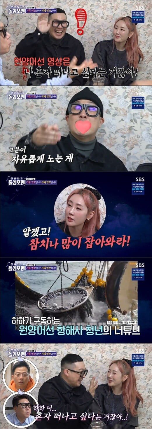 당황한 하하는 "어떻게 알았냐?"라며 진땀을 흘렸고 이상민은 "원양어선 영상은 나 혼자 떠나고 싶다는 거 아니냐. 세상에 모든 짐을 내려놓고 떠나는 거 아니냐"라고 팩폭을 날렸다.
