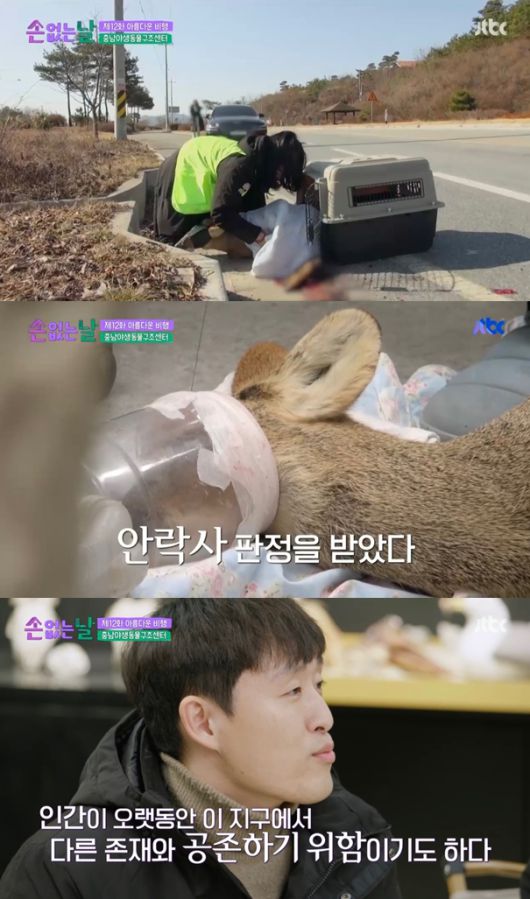한 재활관리사는 인터뷰를 진행하는 중에, 구조 전화를 받고 고라니 새끼를 포획하기 위해 청양으로 향했다. 무사히 고라니를 포획한 재활관리사는 고라니의 현 상태에 대해 "지금 엉덩이 쪽이 아예 구멍이 난 걸로 보여 상태가 많이 심각해 보인다"며 재빨리 발걸음을 옮겼다.