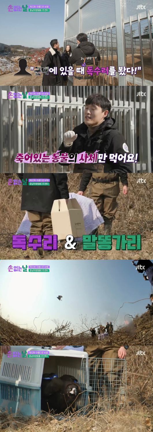 21일 방송된 JTBC 예능 프로그램 '손 없는 날'에서는 농약에 중독된 채 구조돼 야생동물 구조 센터에서 치료를 받은 후 비로소 자연으로 이사 가는 독수리의 이주 스토리가 전파를 탔다.