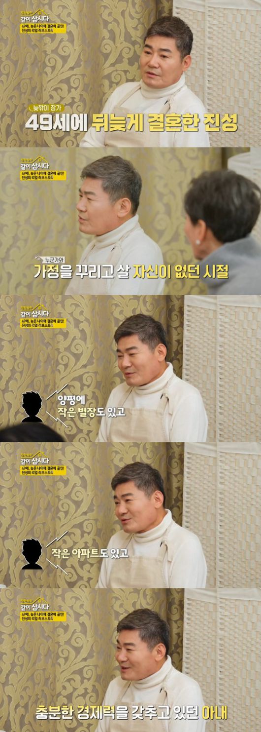 진성은 "아내를 소개로 만났는데, 소개해준 지인이 아내에 대해서 '양평에 별장도 있고, 아파트도 있다. 잔고도 꽤 있으니 부담 없이 만나라'고 이야기하더라. 솔직히 구미가 당겼다"고 아내의 재력을 덧붙여 웃음을 자아냈다.