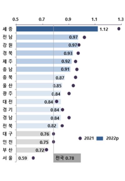 2020년 0.75명, 2021년 0.73명보다 더 떨어져 역대 최저를 나타냈다.
