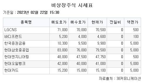 22일 비상장 주식 시장은 호가 변화가 없었다.
