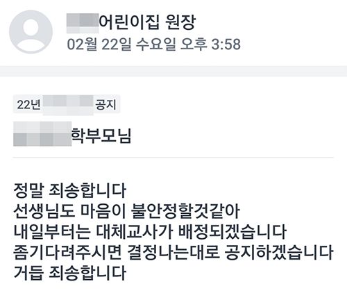어린이집 측은 “선생님도 마음이 불안정할 것 같아 내일부턴 대체교사가 배정되겠고 결정이 되는대로 공지하겠다”고 거듭 사죄했다.