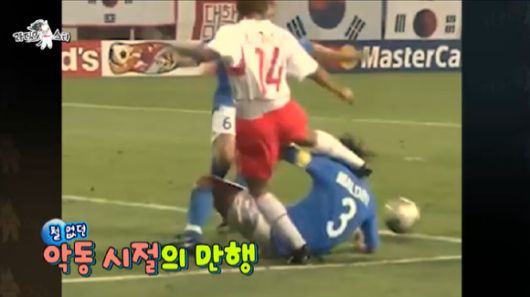 2002년 월드컵에서 이천수가 이탈리아 말디니 선수 뒤통수를 때린 반칙 장면이다. [사진=MBC '라디오스타 캡처'] |