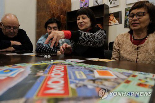 지난 1일 폴란드 크라코프에서 모노폴리 게임을 하는 우크라이나 난민(오른쪽서 두번째) |