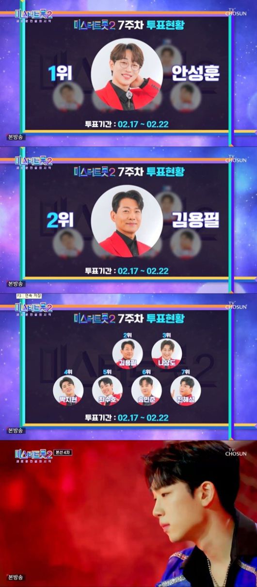 23일 방송된 TV CHOSUN '미스터트롯2'에서는 7주 차 온라인 응원 투표 결과가 나왔다.