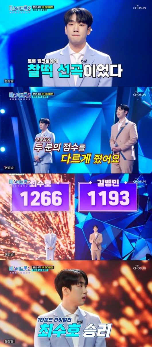23일 오후 방송된 TV CHOSUN '미스터트롯2'에서는 최수호와 길병민의 라이벌전 대결이 벌어졌다.