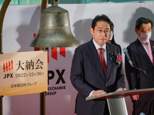 기시다 후미오 일본 총리가 지난해 말 일본 도쿄의 도쿄증권거래소(TSE)에서 2022년 거래 마감을 알리는 대납회에 참석해 연설하고 있다. [사진=뉴시스] |