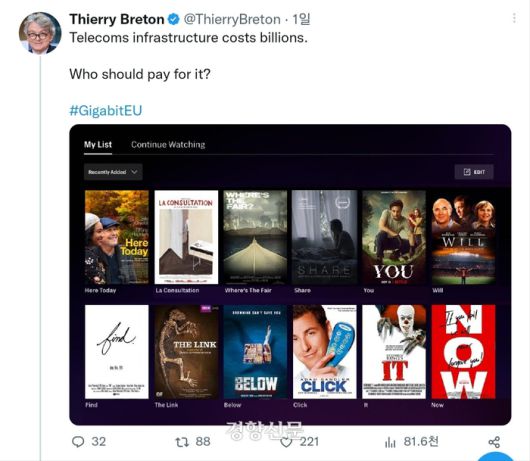 유럽연합(EU) 집행위원회 티에리 브르통 집행위원이 최근 미국 빅테크 기업들의 망 이용료 지불 문제와 관련해 자신의 트위터에 “통신사들의 인프라 투자에 천문학적인 돈이 들어간다. 누가 그 돈을 지불해야 하느냐”는 글을 올렸다. 트위터 갈무리. |