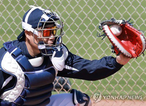 (투손[미국 애리조나주]=연합뉴스) 홍해인 기자 = 26일 오후(현지시간) 미국 애리조나주 투손 키노스포츠 콤플렉스 보조구장 불펜에서 월드베이스볼클래식(WBC) 2023 대한민국 대표팀 포수 양의지가 투수들의 공을 포구하고 있다. 2023.2.27
