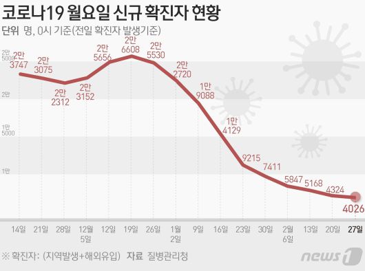 (서울=뉴스1) 김초희 디자이너 = 질병관리청 중앙방역대책본부(방대본)는 27일 0시 기준 신종 코로나바이러스 감염증(코로나19) 신규 확진자가 4026명 발생했다고 밝혔다.a_a@news1.krCopyright ⓒ 뉴스1. All rights reserved. 무단 전재 및 재배포 금지.