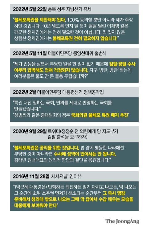 ■ 2023.02.25 정의당, “(불체포특권 폐지) 당론 입각해 표결” 정의당은 27일 이재명 더불어민주당 대표의 체포동의안 표결을 앞두고 당원들에게 "체포동의안 찬성이 곧 이재명 대표 구속 찬성이 아니다"라는 문자 메시지를 보내며 '가결' 방침을 재확인했다.이정미 정의당 대표는지난 25일 오후 당원들에게 보낸 메시지에서 "이미 여러 언론을 통해 보도된 것처럼, 우리 당 의원들은 '국회의원의 불체포특권은 폐지해야 한다'는 당론에 입각해 표결에 임할 예정"이라고 강조했다.