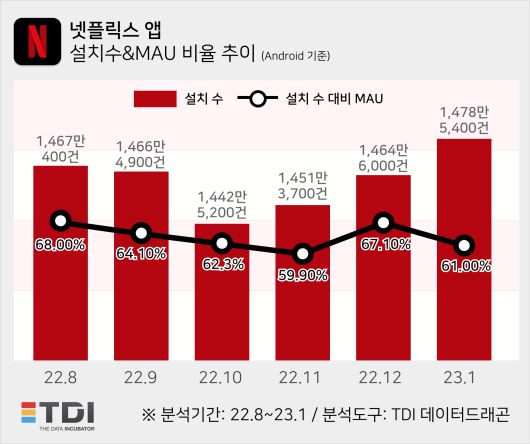 빅데이터 전문기업 TDI(티디아이, 대표 신성균)의 분석 플랫폼 데이터드래곤을 통해 넷플릭스 최근 앱 설치수와 설치수 대비 MAU(월간 활성 사용자 수)를 분석했다.